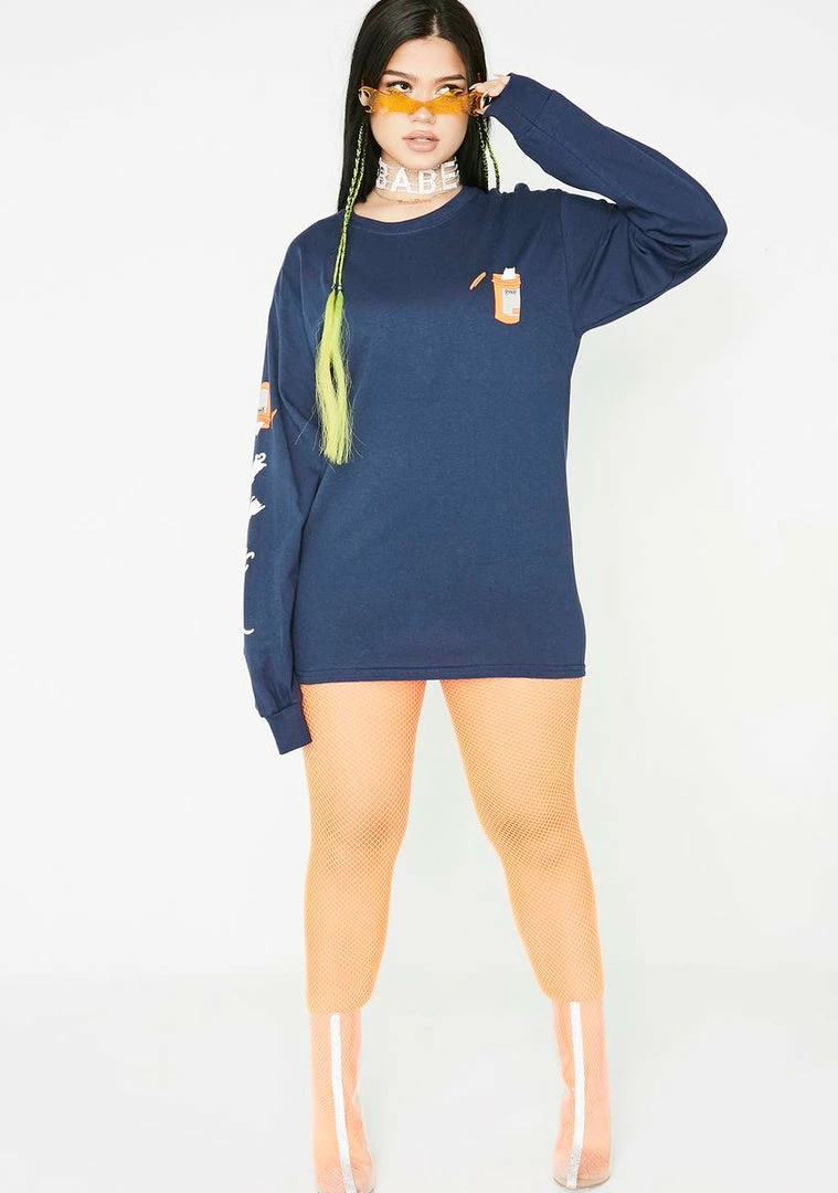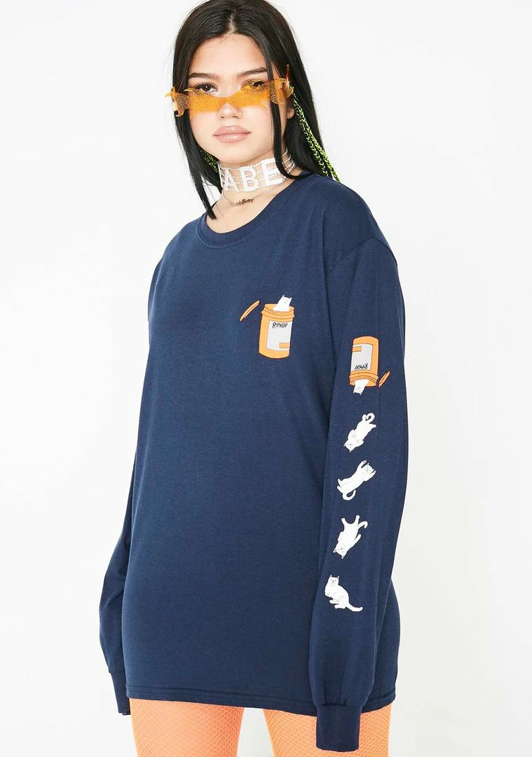 if only my pills actually gave me as much joy as catz⦠This dope long sleeve tee has an oversize fit, banded trim, a graphic of Nermal peekinâ his head out of a pill bottle on the chest, and kitten pillz falling down one sleeve.