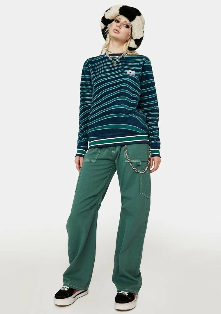 has a dizzy striped pattern, long sleeves, a ribbed crew neckline, and a graphic on the front.