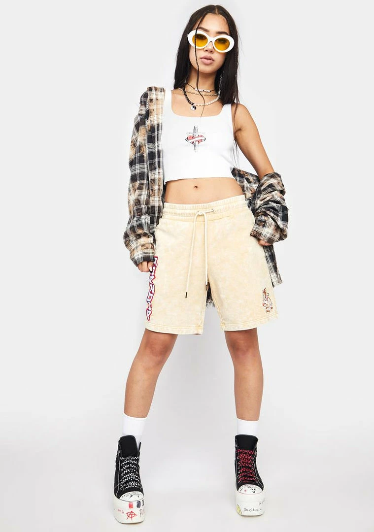 because youΓ’ΒΒre so hot you breathe fire. These cozy lounge shorts have embroidered artwork on both legs, four pockets, and a drawstring waistband.
