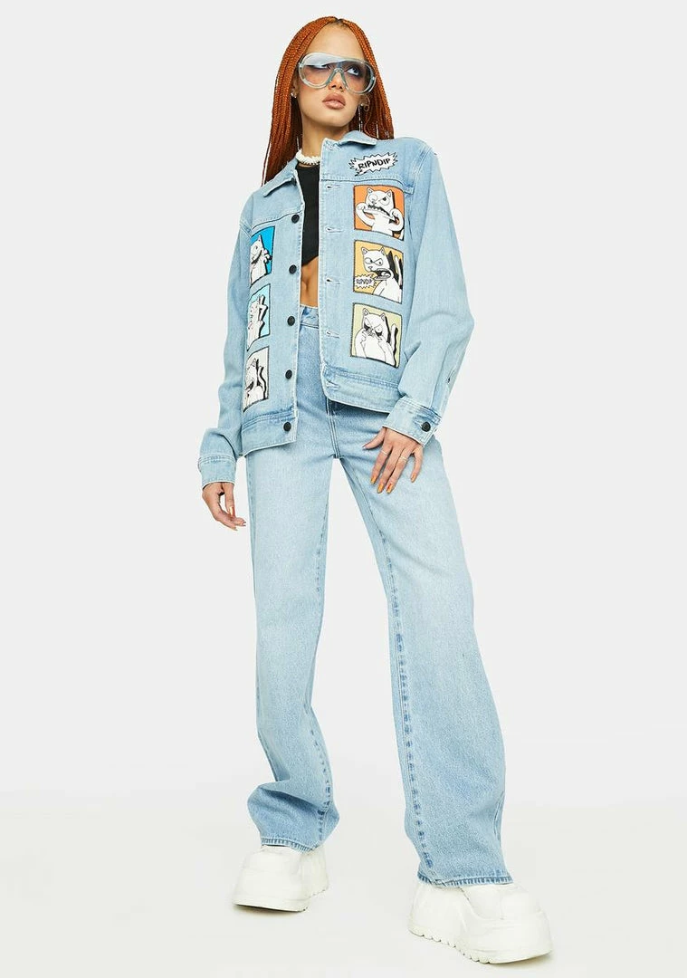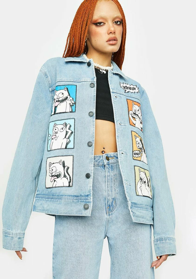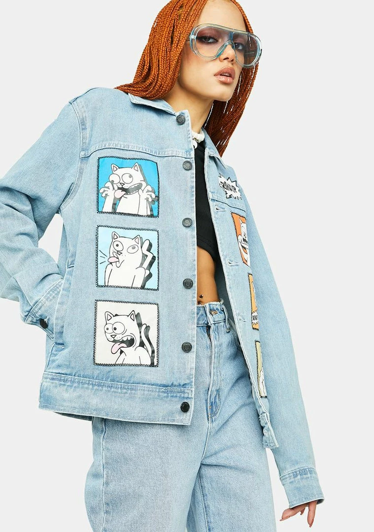 keep it wacky. This denim jacket has a light wash construction, a collared neckline, button closures, embroidered Lord Nermal patches on the front, and a chinille patch on the back.