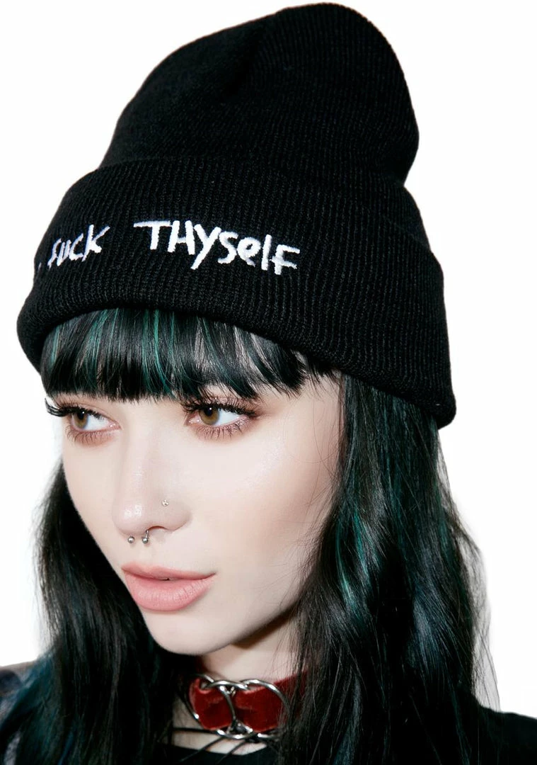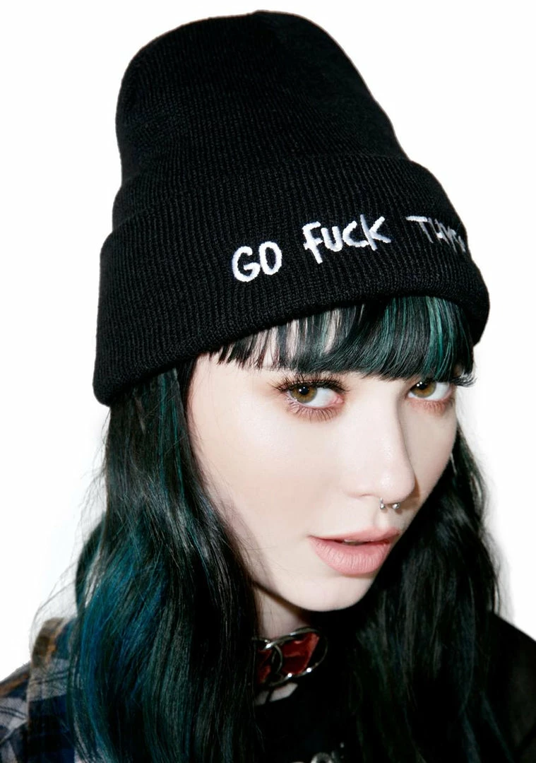 …just fuk right off, mmkay?? This savage beanie features a classic plush knit construction with รขยยgo fuck thyself embroidered on the cuff.