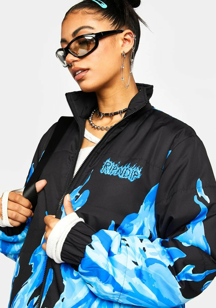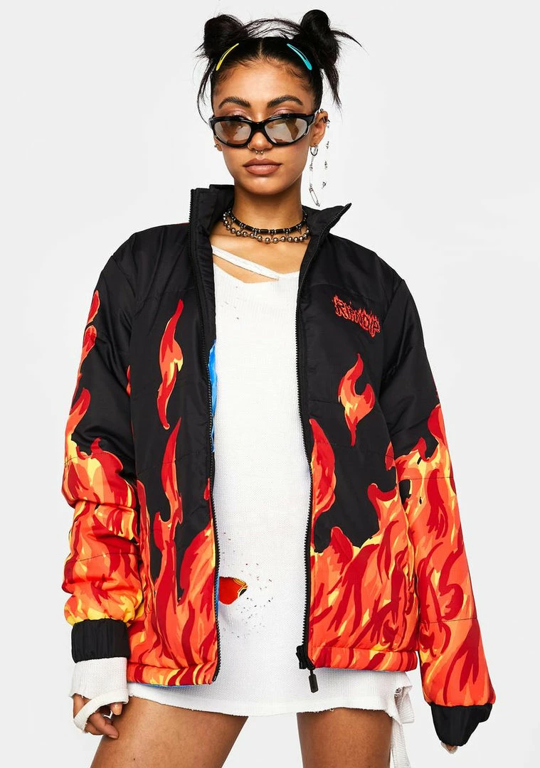 have some faith. This puffer jacket is reversible with both Lord Nermal and Lord Alien graphics with a flame print, elastic sleeve cuffs, side pockets, and a front zipper closure.