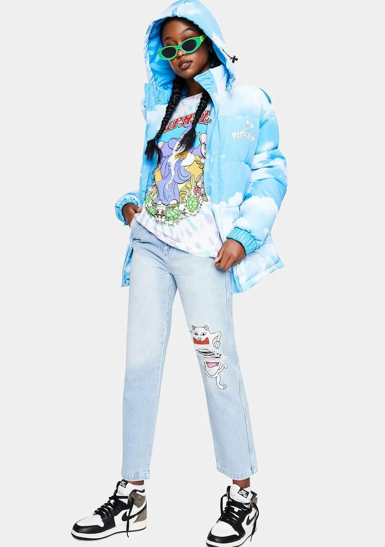 cuz everyone wants a piece of u. These light wash jeans feature embroidered biting nerm art on the front knee and back pocket, slight distressing, and straight leg fit.