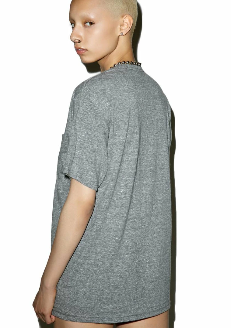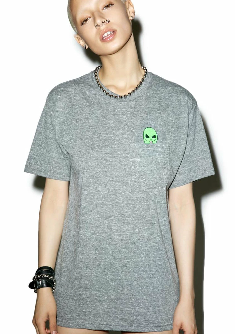 …this planet is f*xkinâ weird. Give yer alien dude somewhere to chill wit this dope short sleeve tee, featurinâ a super soft heather grey construction, chest pocket, and a graphic of an alien head peekinâ out that reveals him flippinâ ya off when you look inside.