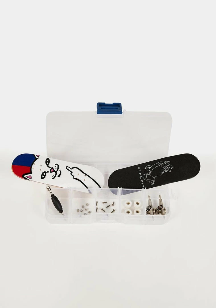 comes with a lil mini board with a classic multicolored Lord Nermal graphic on bottom, a foam grip with a prayer hands graphic, metal trucks, wheels, a skate tool and screws so you can build it urself!