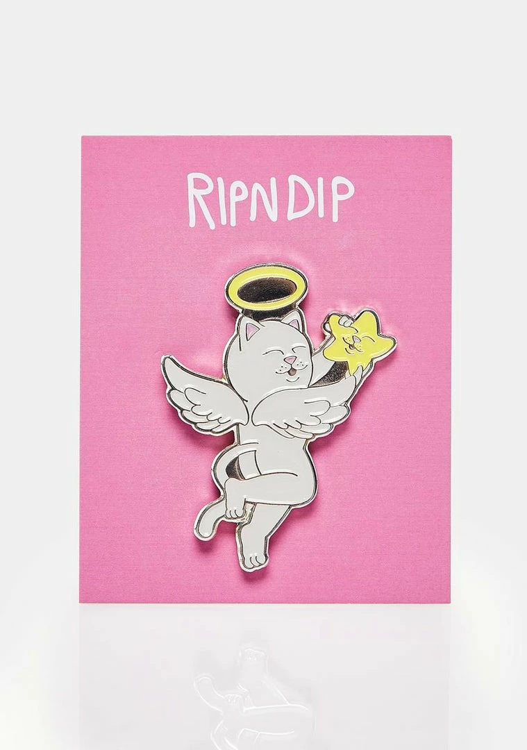 will rock you to sleep. This enamel pin has an angelic Nermal holding a star at front and double posts with rubber clasps at back.