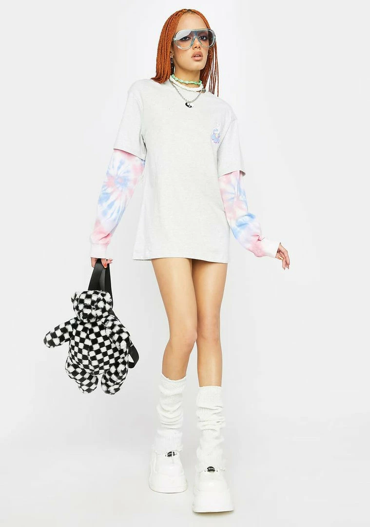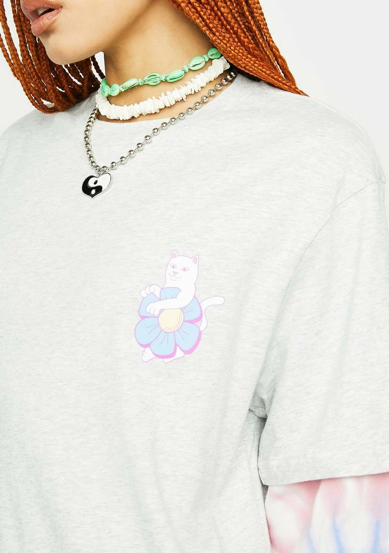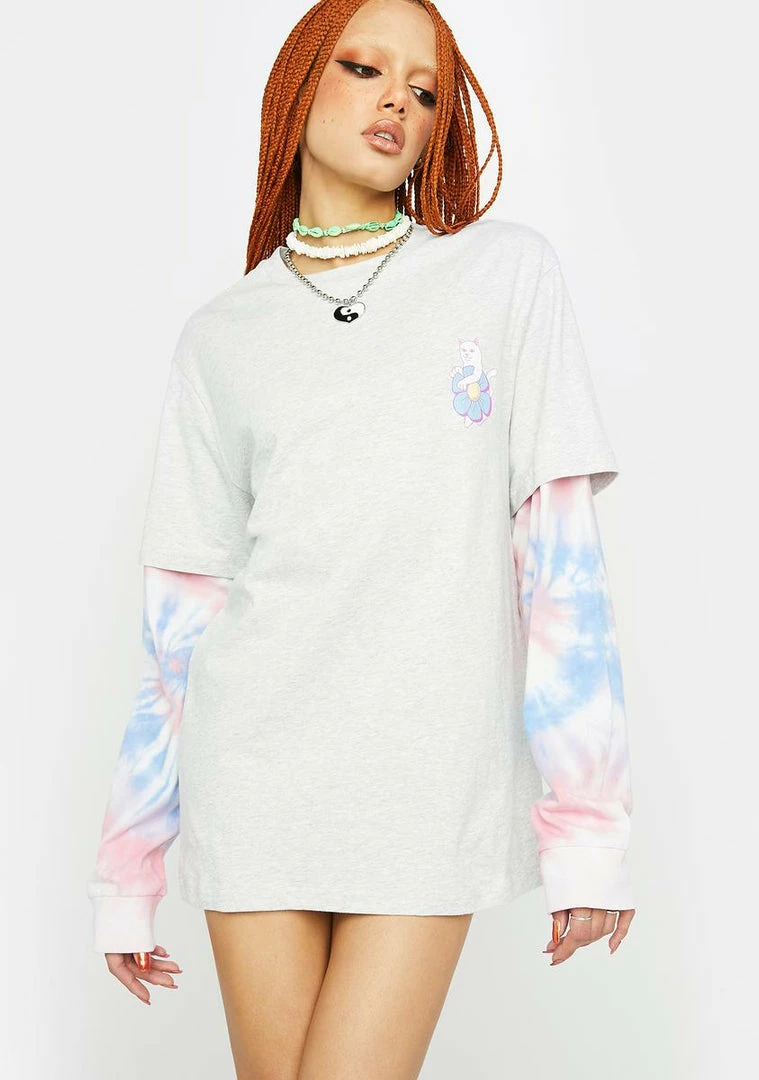 bow down to Mother Earth. This oversized tee has a layered design with a tie dye long sleeve, a Lord Nermal graphic on the chest, and ‘Nature Is Healing’ graphics across the back.