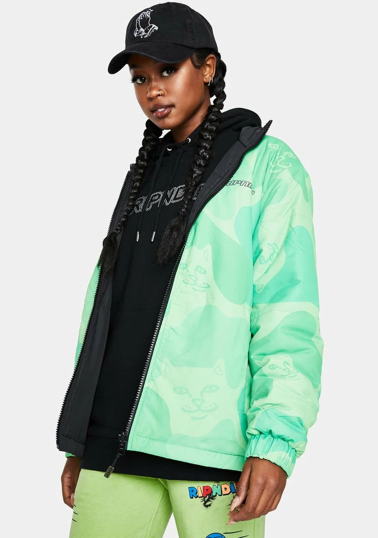 because itâs a whole new world with u. This puffer jacket has a front zip closure, collared neckline, ripndip logo at the back, and reversible construction with bubble nerm design on one side.