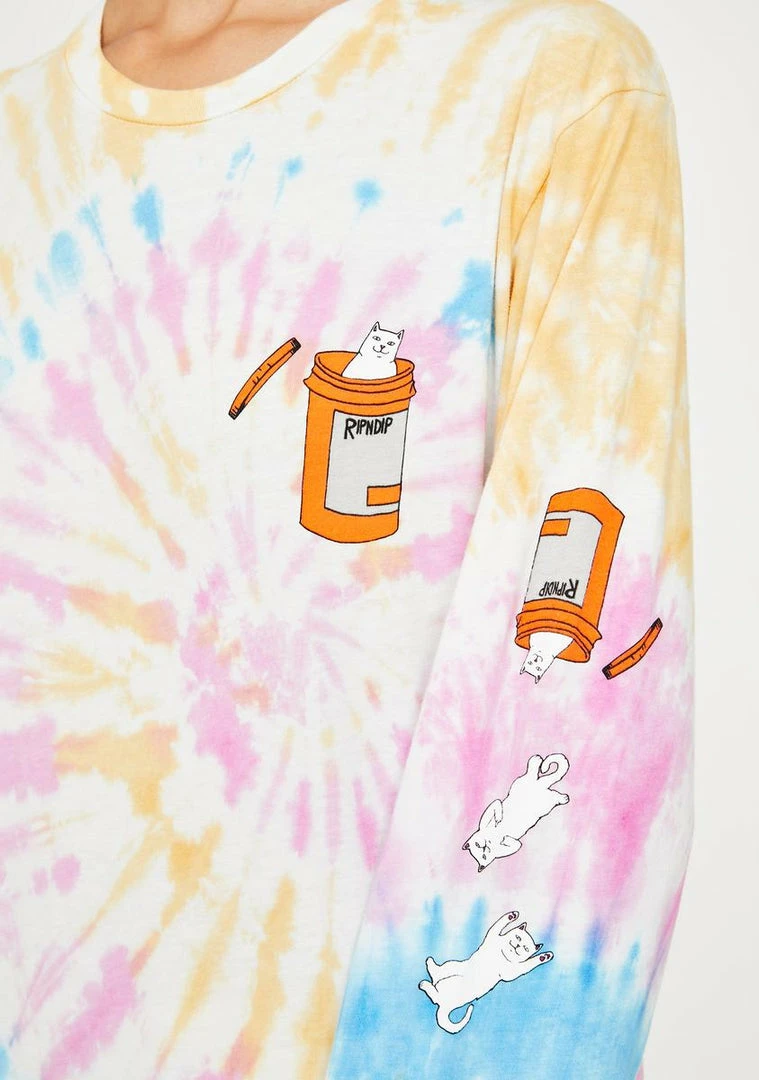 if only my pills actually gave me as much joy as catzΓ’ΒΒ¦ This dope long sleeve tee features a sikk tie dye cotton construction, oversize fit, banded trim, a graphic of Nermal peekinΓ’ΒΒ his head out of a pill bottle on the chest, and kitten pillz falling down one sleeve.