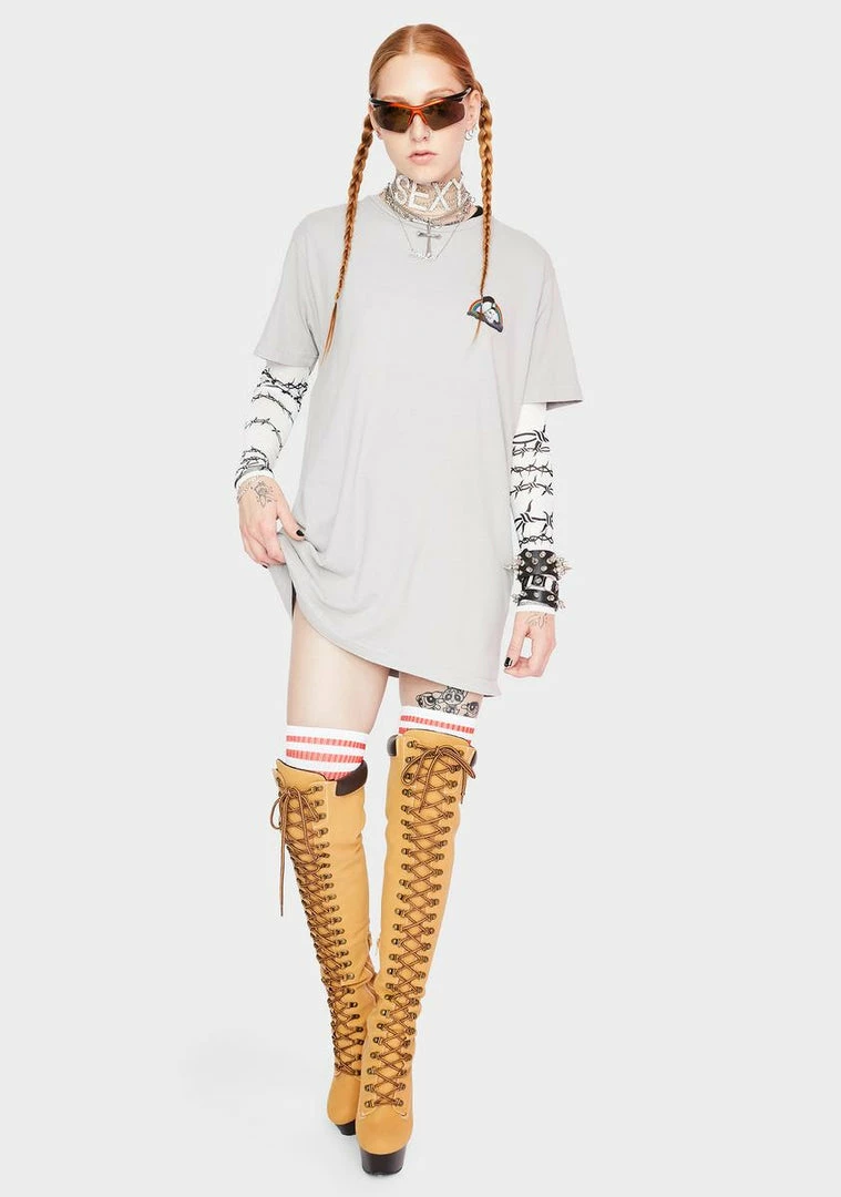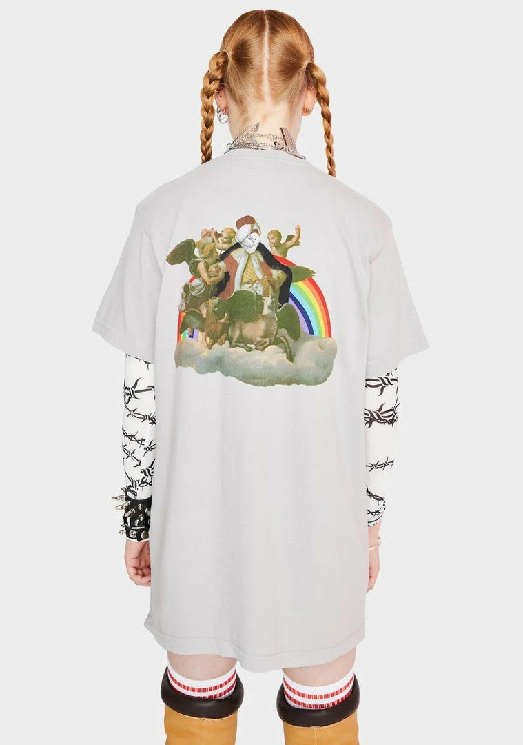 because you and the crew are heaven sent. This short sleeve graphic tee features a screen printed design on the back with a rainbow and cat on a cloud, and a lilรขยย version on the front.