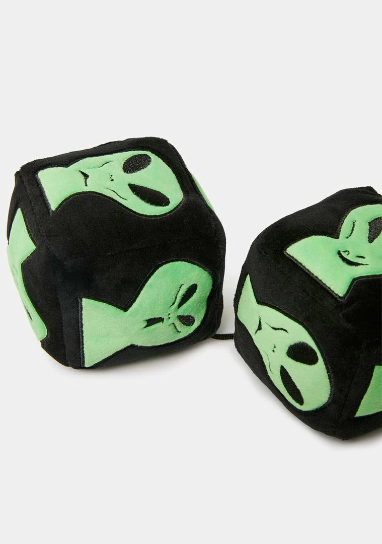 greetings from the other side. These dice come in a plush construction, with alien graphic details all over, and a string for hanging.