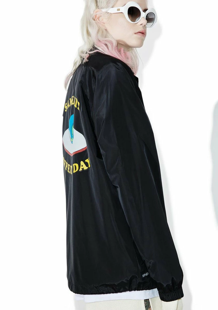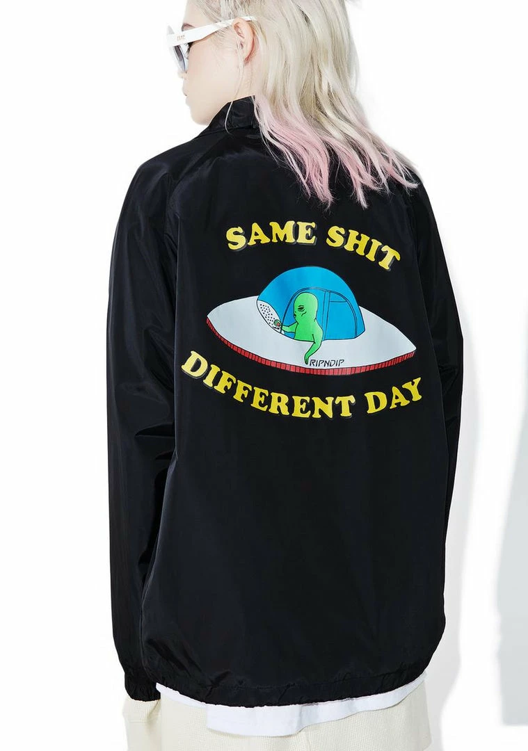 …back to the grind, dude. Show Γ’ΒΒem that the other parts of tha galaxy can be a total drag too in this dope coach jacket, featurinΓ’ΒΒ a sleek black construction, drawstring at the hem, grey lining reading Γ’ΒΒSame ShitΓ’ΒΒ all over, interior pocket, snap button front closure, and a graphic of an alien Γ’ΒΒn UFO with lettering reading Γ’ΒΒSame Shit, Different DayΓ’ΒΒ on tha back.