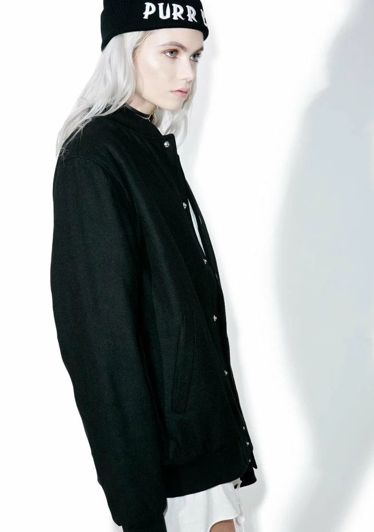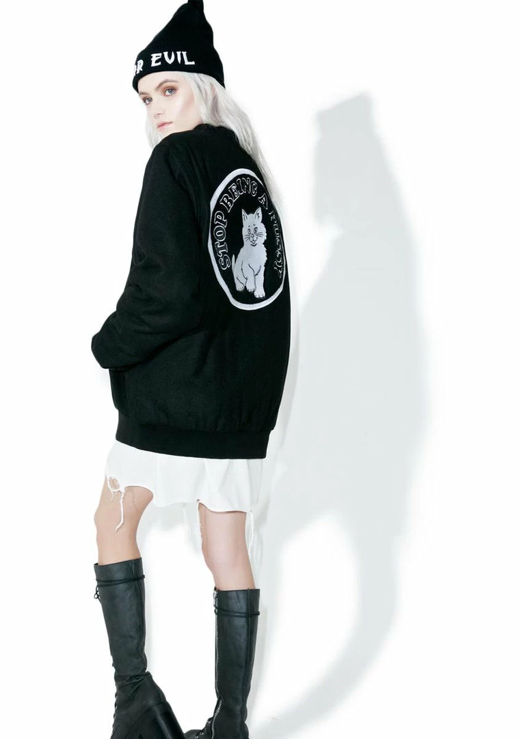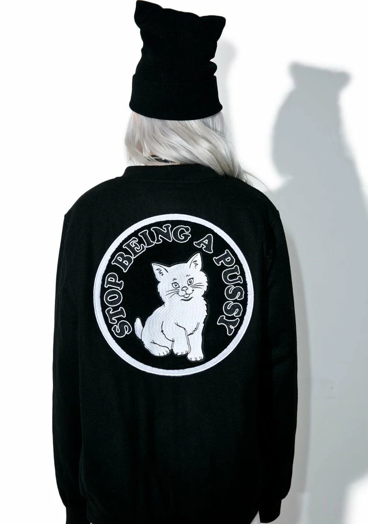 …those cuts âN scratches donât look so bad! Thie sikk jacket features a cozy black wool construction, quilted lining wit inside pocket, ribbed trim, bigass embroidered cat patch on tha back and chest reading âStop Being A Pussy,â and snap closures.