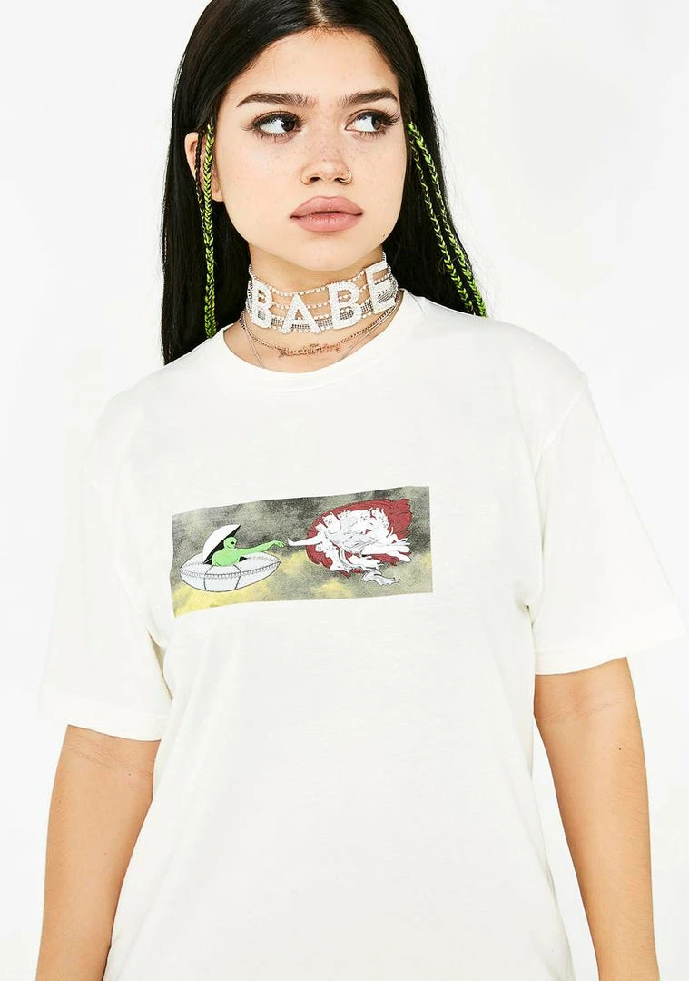 cuz were you sent down from the heavens or the aliens bb? Youâre the greatest gift to earth with this rad tee that has short sleeves, a relaxxed fit, and a Nerm godz versus alienz graphic on the front.