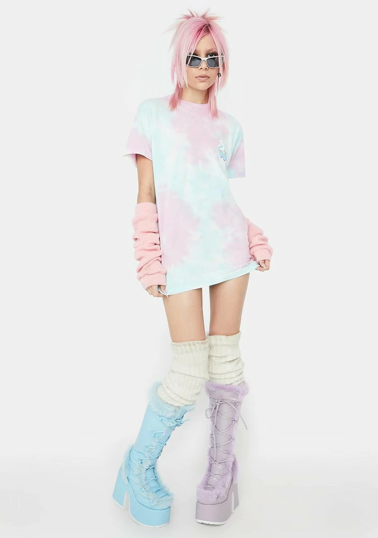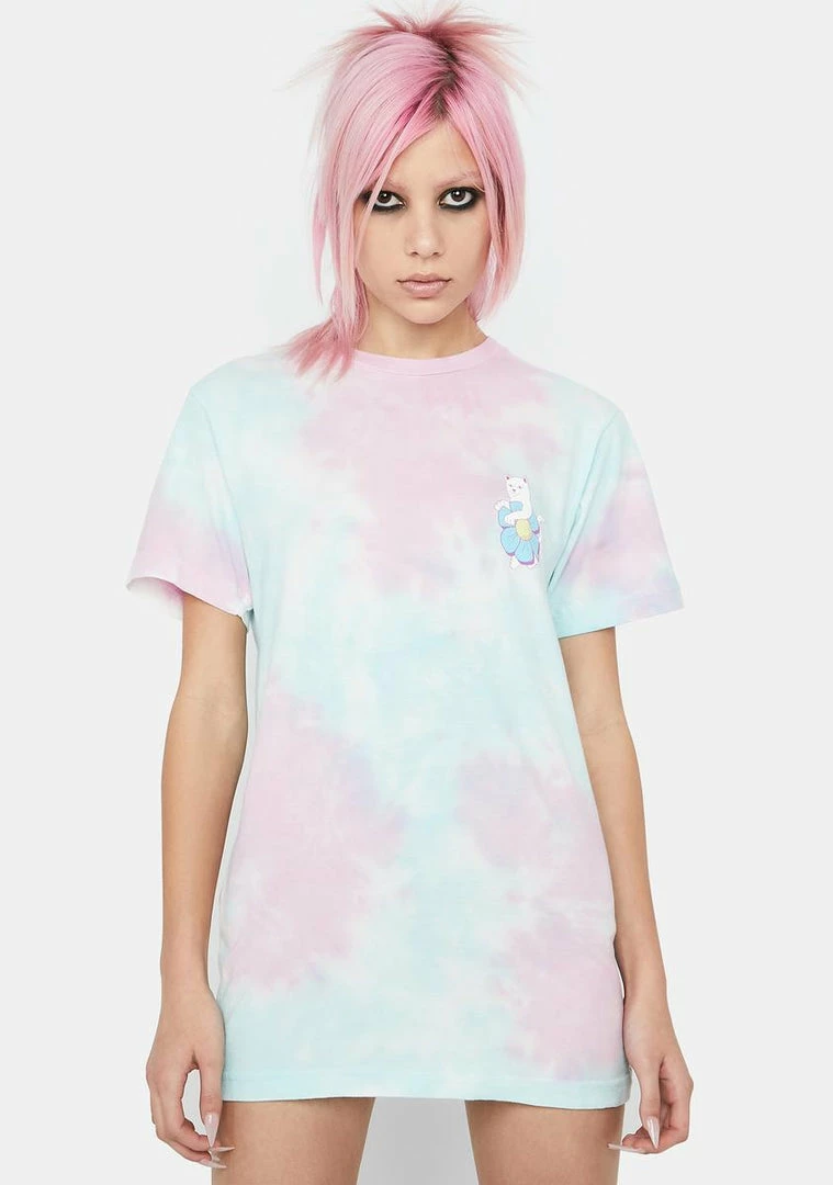 features a pastel tie dye design, screen print graphics on the chest and back, and an oversized fit.
